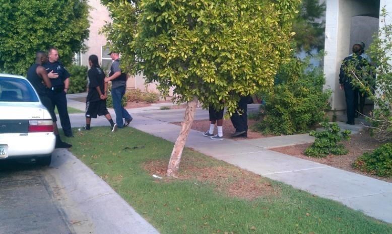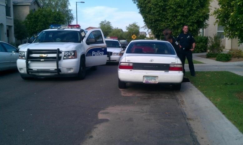 Multiple cruisers arriving in front of our suspect house. Imagine our relief when out pops “corn rows” in cuffs!