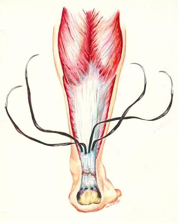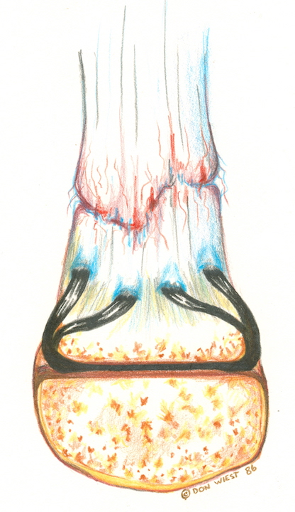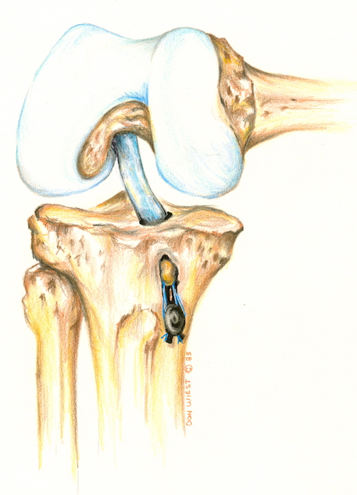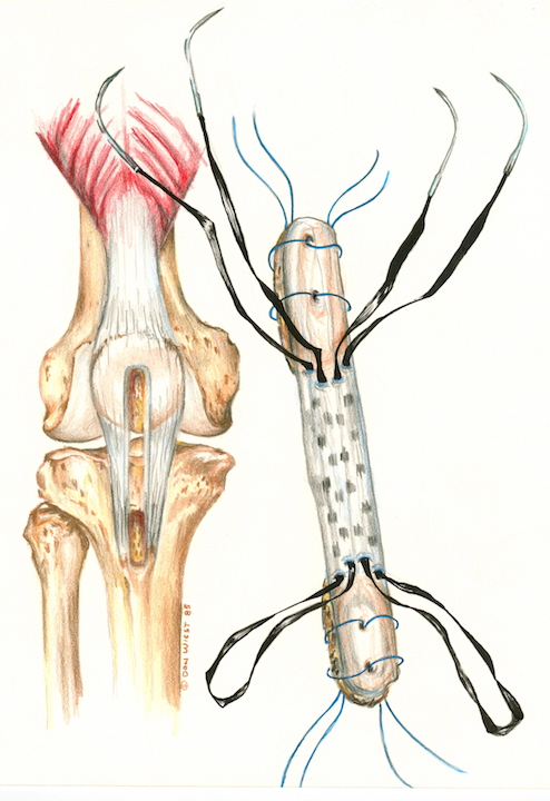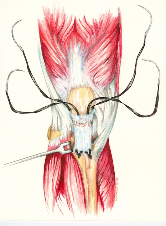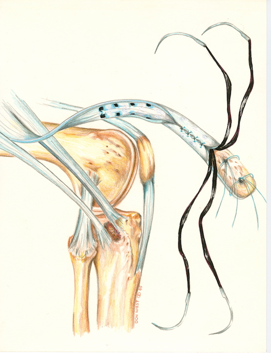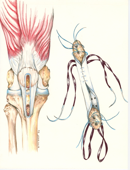 In 1985 doctors Rush, Wells, and Manley, of Northwest Orthopedics Group partnered with Hexcel Medical to assist with the development and testing of a new carbon fiber filament suture intended for the repair of sports related injuries. I was commissioned to observe surgical procedures and develop a series of medical illustrations that depicted the suture as it was incorporated in various operations.